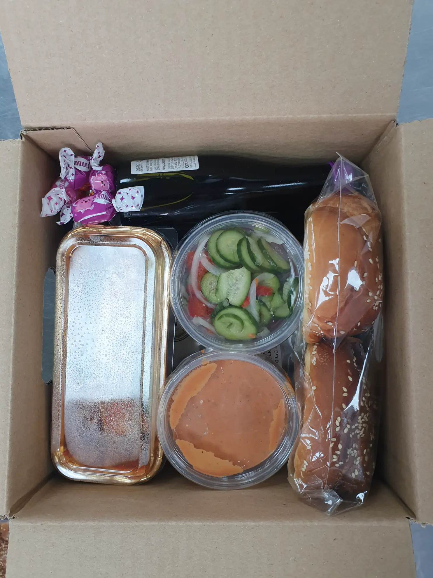 ואז, כמו מלאך משמיים, הגיע אלינו שליח צדיק וטוב, ונתן לנו קופסה עם סעודה – אוכל טרי, טוב, מושקע וטעים.
