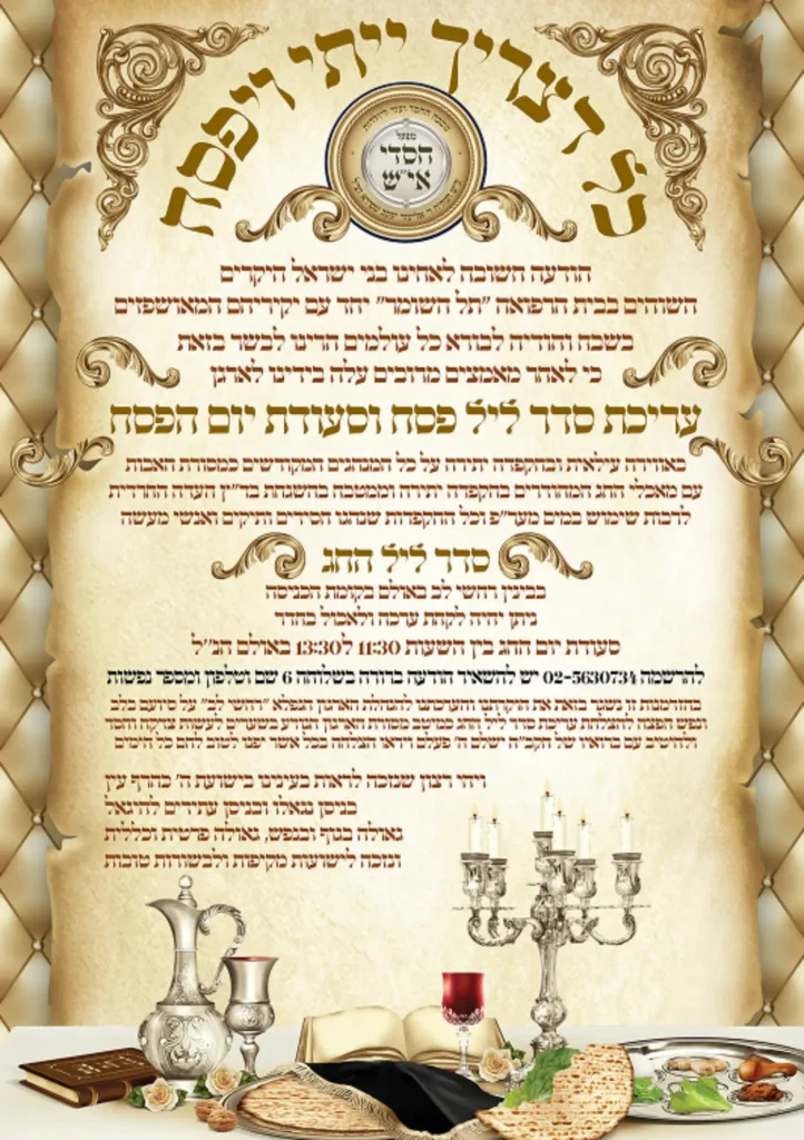 שכוללות מצות יד מהודרות יין, קערה עם הסימנים, דגים, סלטים, מרק עופות, בשר וליפתן